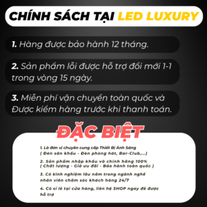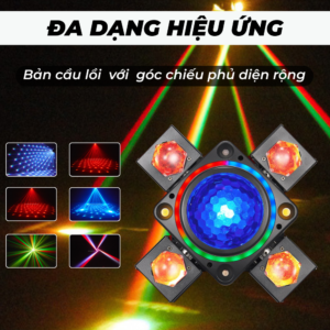 - Hệ thống bóng đèn: 10 bóng LED 15W 4IN1 ( x1 bóng Laser đỏ 100MW, x1 bóng Laser xanh lá 100MW, x2 ánh sáng vàng 10W, x2 ánh sáng trắng 10W)