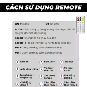 - Chế độ hoạt động: Cảm biến âm thanh, DMX, tự động, điều khiển từ xa